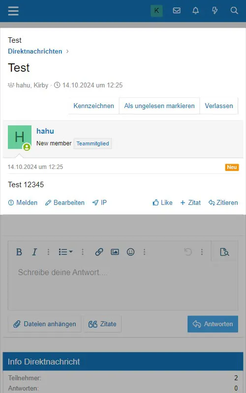 Im Gegensatz zum klassischen Nachrichtensystem stellt XenForo dem Benutzer ein deutlich leistungsfähigeres Direktnachrichtensystem zur Verfügung. Die Kopfzeile enthält einen Link zu den Direktnachrichten in Form eines Briefumschlags.